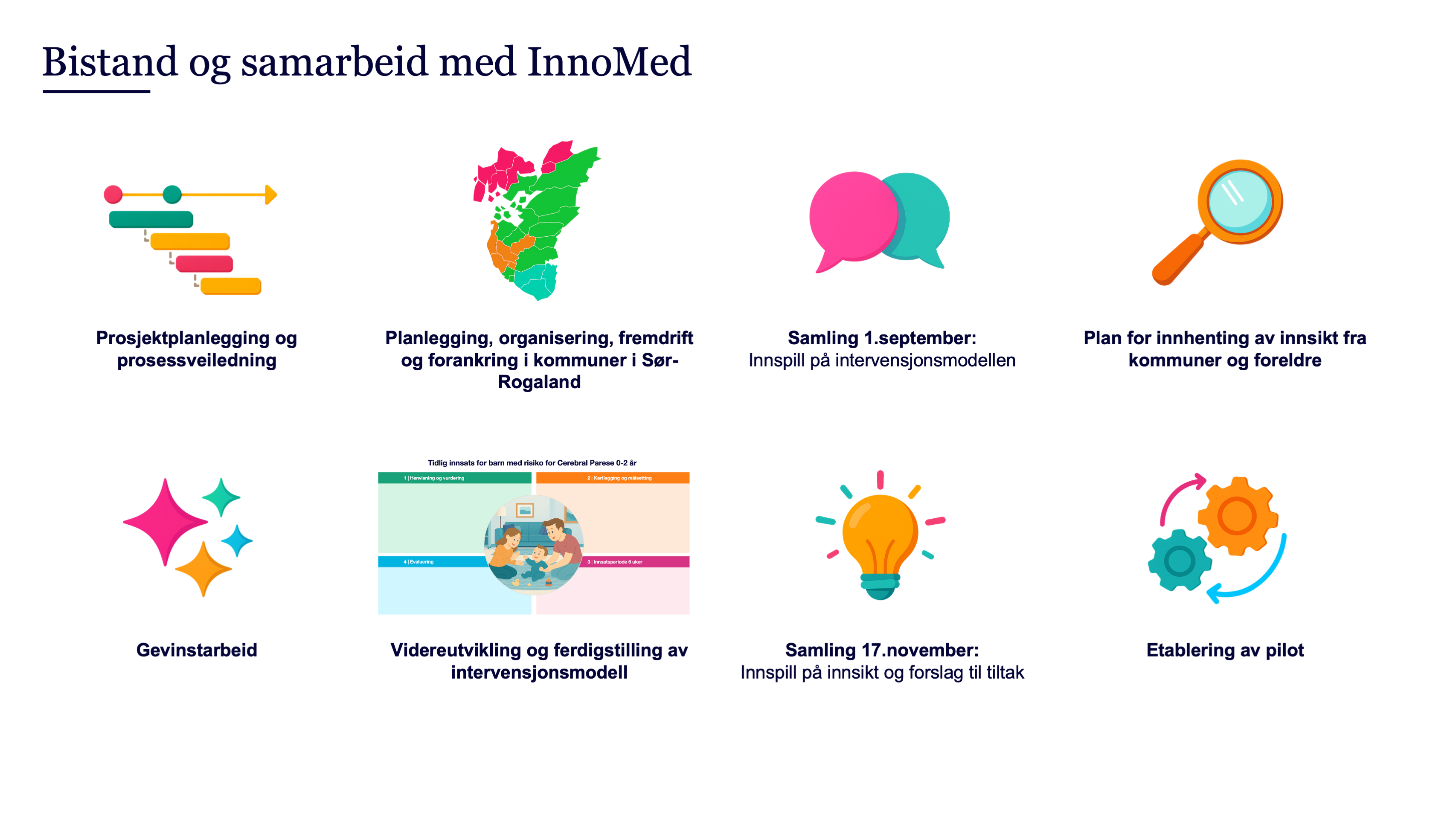 Fra x til x har InnoMed støttet prosjektet "Tidlig innsats for barn 0-2 år med eller risiko for Cerebral Parese". Målet med prosjektet er å utvikle en bærekraftig intervensjonsmodell om tidlig intervensjon i tråd med nasjonale retningslinjer som sikrer likeverdige tjenester for barn med eller risiko for Cerebral Parese 0-2 år.