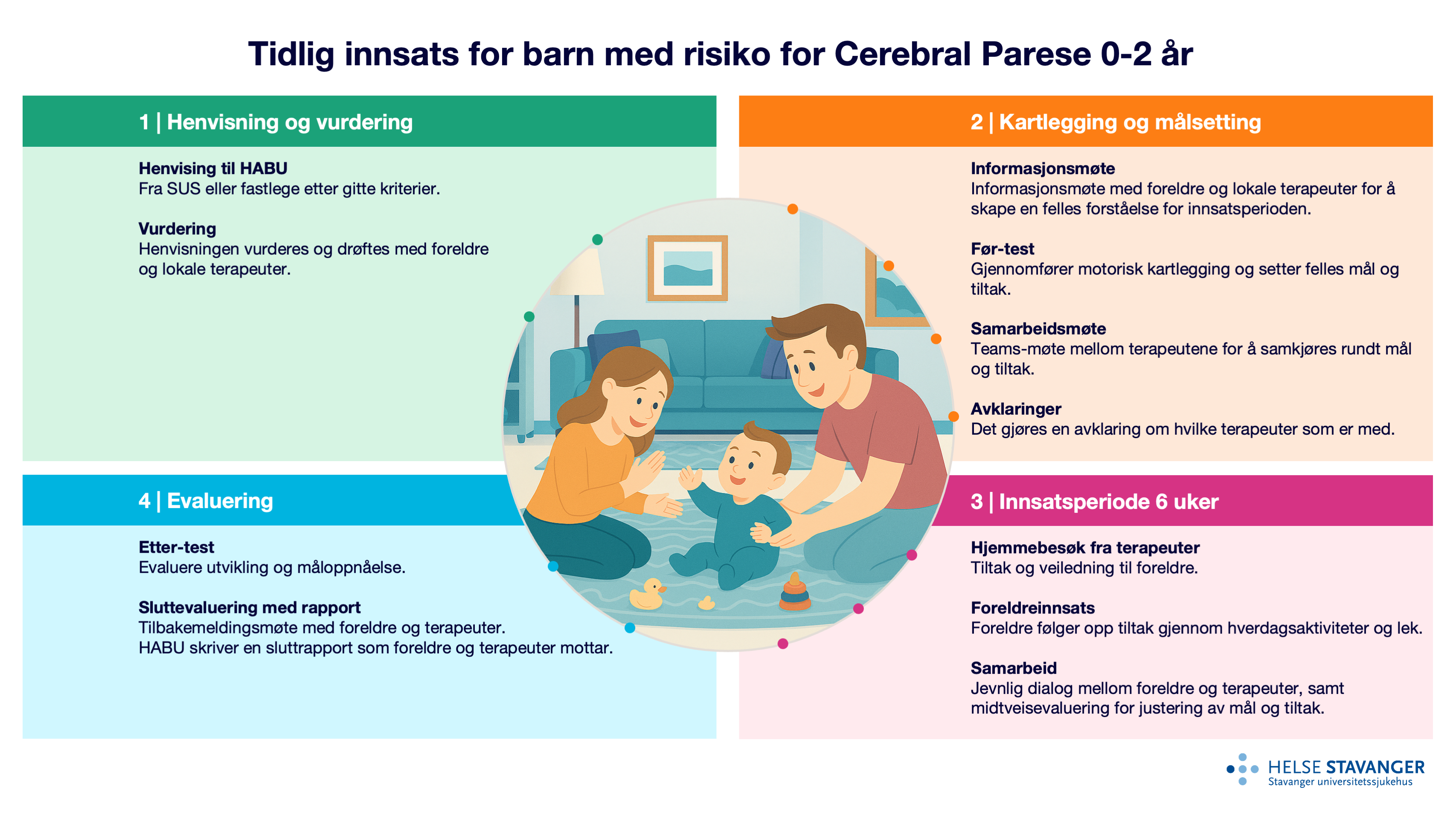Vi har nå utviklet en intervensjonsmodell som skal testes ut i samarbeid med de kommunale fysio – og ergoterapitjenestene i Sør-Rogaland. Det planlegges for fem piloter i løpet av 2026. Det vil bli samlet inn erfaringer fra foreldre og terapeuter etter hver pilot. Samtidig vil man arbeide videre med prosedyre og forankring både i kommuner og ved HABU Stavanger. Målet er at tilbudet skal iverksettes i drift. På lengre sikt kan det være aktuelt å spre tilbudet nasjonalt til andre kommuner og habiliteringssteder.