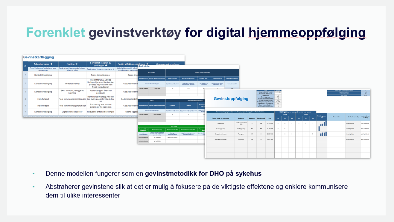 Prosjektet har hatt fokus på gevinstarbeid allerede i oppstartsfasen av digital hjemmeoppfølging (DHO). Dette har bidratt til en felles forståelse av hvorfor gevinstarbeid er viktig, og hvordan det skal gjennomføres. - Utviklet struktur og metodikk for gevinstarbeid:
